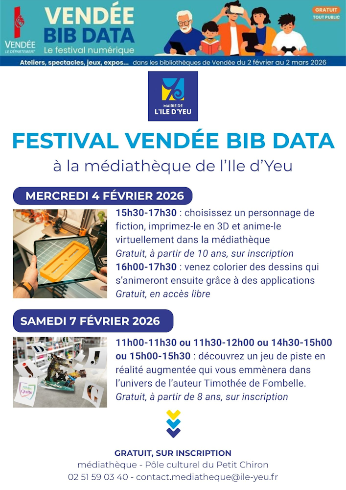 Renseignements : 02 51 59 03 40 ou contact.mediatheque@ile-yeu.fr