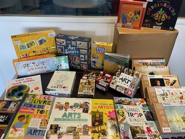 Les malles ARTS proposent un ensemble de jeux de société et livres dédiés à la découverte ludique de l’univers artistique : peinture, dessin, sculpture, couleurs, formes, …